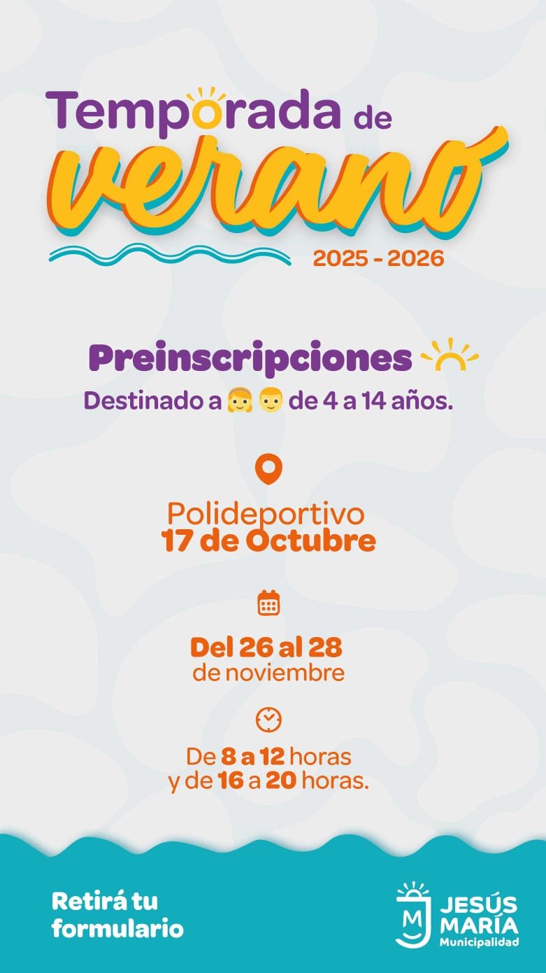 *Jesús María abre las preinscripciones para la temporada de verano en los polideportivos*_Niños y adolescentes de 4 a 14 años podrán anotarse entre el 26 de noviembre y al 28 de noviembre. Cada poli tendrá su propio cronograma y modalidad._La Municipalidad de Jesús María inicia el proceso de preinscripciones para la temporada de verano en los polideportivos 17 de Octubre y Sierras y Parques. Será una nueva edición de la propuesta que cada año reúne actividades recreativas, deportes, juegos y natación para acompañar a los chicos durante los meses de calor.*Lo que tenés que saber**Polideportivo 17 de Octubre** Del 26 al 28 de noviembre.* Horarios: 8 a 12 y 16 a 20 horas.*Polideportivo Sierras y Parques** Del 26 al 28 de noviembre.* Horarios: 18 a 20:30 horas.La Municipalidad recuerda que las preinscripciones son presenciales y recomienda a las familias asistir dentro de los días y horarios establecidos para garantizar una buena organización. La temporada, que se desarrollará durante diciembre y enero, busca promover el movimiento, la convivencia y la vida al aire libre como parte de una propuesta integral para las infancias de la ciudad.