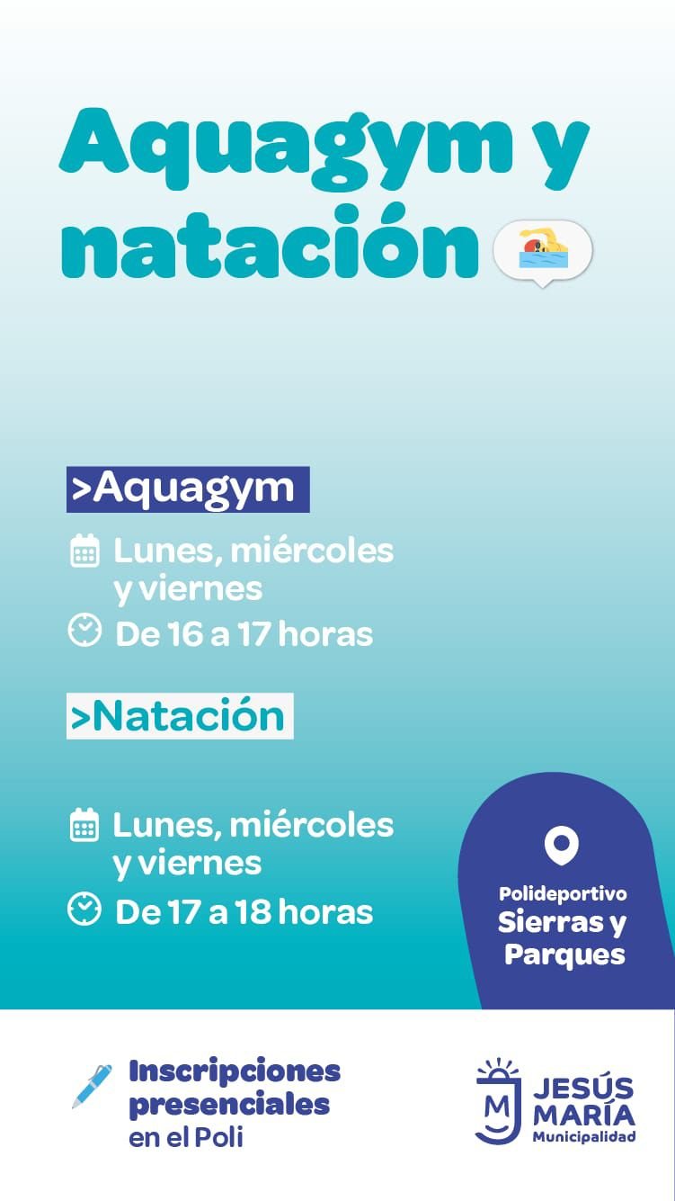La Municipalidad de Jesús María informa que se realizarán las inscripciones para las clases de Aquagym y Natación para adultos, en dos fechas destinadas a organizar la propuesta deportiva de la temporada.